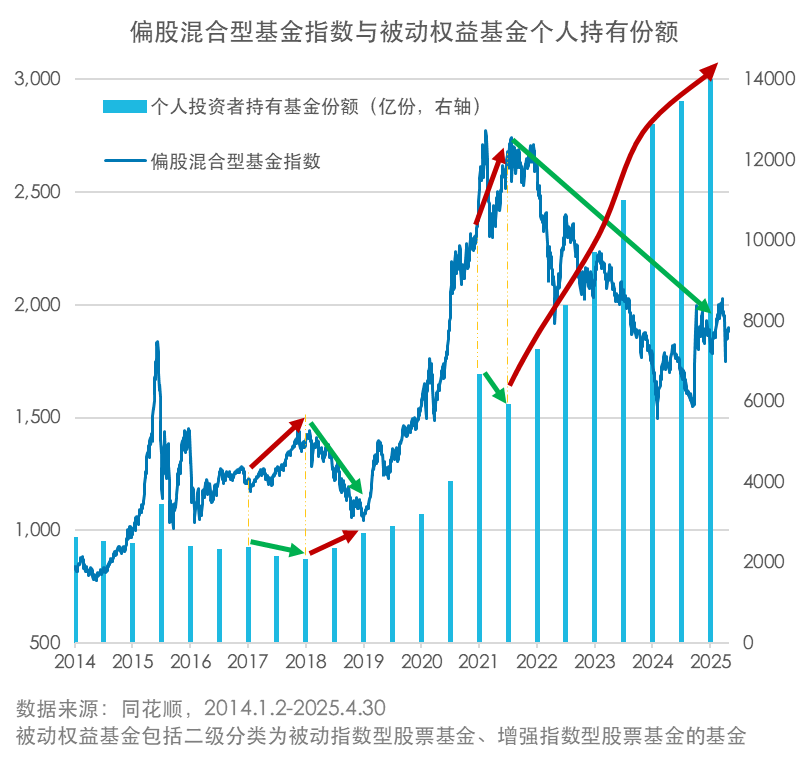 基金季报数据显示,截至2024年三季度末,被动股票基金持有的股票市值接近主动偏股基金,而2024年四季度末的数据显示,前者已经超越后者。结合近几年市场的变化整体来看,在市场下跌、估值持续走低的过程中,投资者更倾向于选择被动权益基金参与逆向投资。