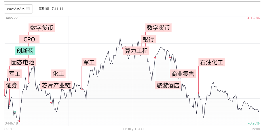 财联社6月27日电,市场全天冲高回落,创业板指领跌。个股跌多涨少,全市场超3600只个股下跌。沪深两市全天成交额1.58万亿,较前日缩量196亿。1)银河证券预计,军工元器件6月份订单将扭转下行趋势,下半年订单增速有望随年内二次需求释放而逐步转正。军工板块受到国内订单和国外军贸预期转暖双重提振继续强者恒强,长城军工、万里马双双加速向上晋级,20厘米股国瑞科技在内的多只低位首板股也顺利实现晋级。2)香港特区政府发表《香港数字资产发展政策宣言2.0》,提出通过实践展示代币化的实质应用,推进应用场景的多元化。稳定币概念热度依旧居高不下,吉大正元晋级4连板,人气股京北方晋级2连板创历史新高,带动信安世纪、科创信息等低位股批量涨停。3)美股固态电池概念股QuantumScape宣布,其下一代固态锂金属电池技术取得突破性进展。固态电池概念早盘继续冲高后展开分歧,此前走出5连板的湘潭电化午后率先转跌,拖累诺德股份、兴业股份双双炸板回落。但天际股份、大东南双双晋级3连板,东方锆业、佛塑科技等上游材料端低位品种继续展开批量补涨。4)受到港股香港中旅午后一度飙升179%刺激,旅游股率先走强,进而带动零售、食品饮料等消费股回暖,天目湖、曲江文旅、南京商旅、银座股份封涨停。