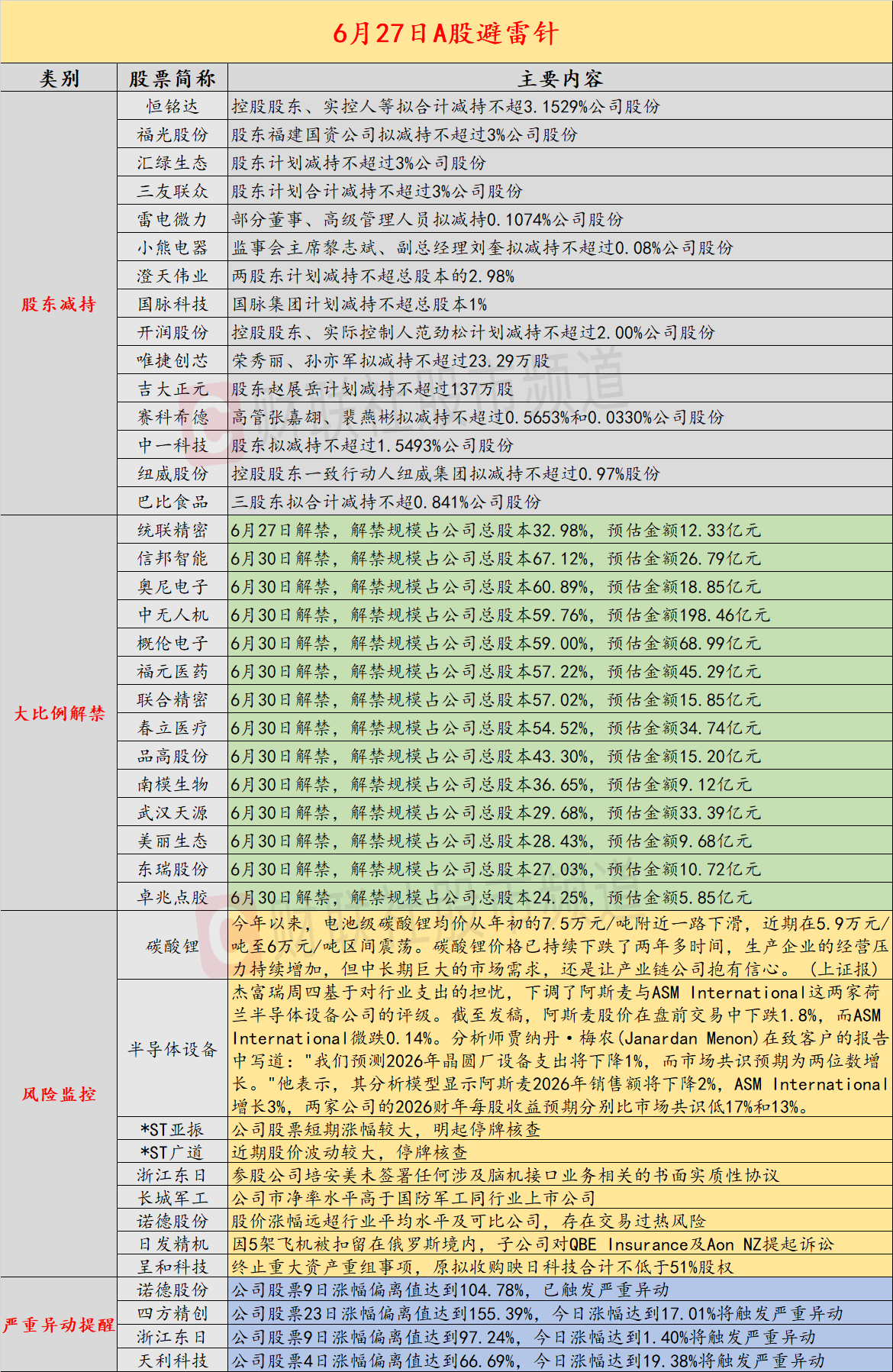 昨日公告的A股拟减持的公司数量较之前有所减少,恒铭达控股股东、实控人等拟合计减持不超3.1529%公司股份,福光股份股东福建国资公司拟减持不超过3%公司股份;统联精密、信邦智能将迎来超三成以上解禁;6月A股IPO受理迎小高峰,上半年超百家公司“赶考”;*ST亚振公司股票短期涨幅较大,明起停牌核查;电池级碳酸锂价格一路下滑,产业链公司仍抱有信心;*ST广道近期股价波动较大,停牌核查;美联储官员COLLINS表示,7月降息可能为时过早。