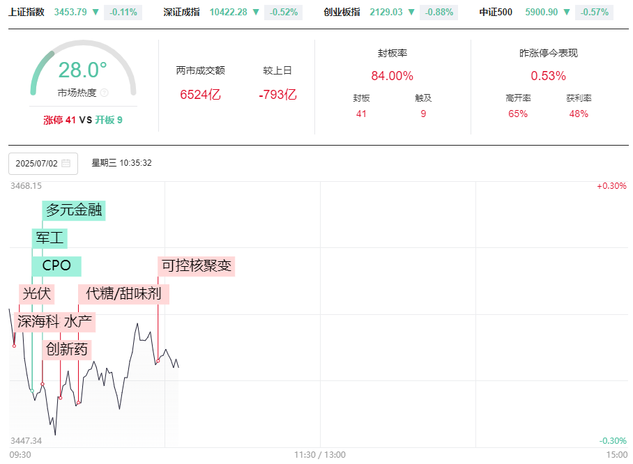 市场早盘震荡调整,创业板指领跌。成交量方面,第一个小时两市缩量689亿元。板块方面,早盘市场热点集中在海洋经济方向,除此之外其余热点较为杂乱。下跌方面,半导体、算力硬件等科技股跌幅居前,金融及稳定币概念股也持续调整。