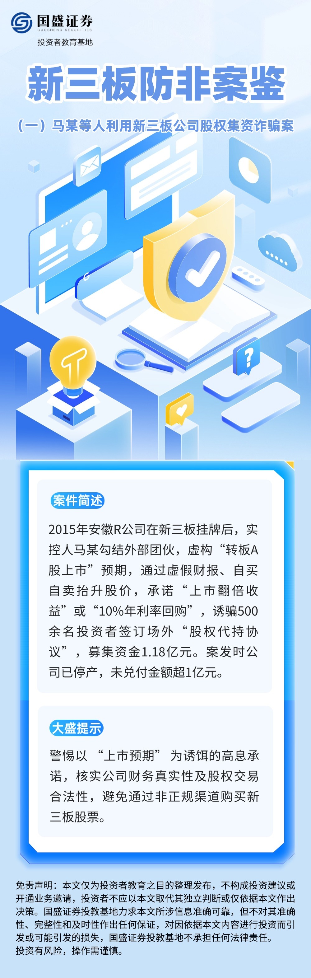 编者按:为帮助广大投资者精准识别新三板市场中的典型骗局与非法金融活动,国盛证券投资者教育基地特推出《新三板防非案鉴》系列图文,帮助大家提升风险防范意识和自我保护能力。下面,一起来看看吧!