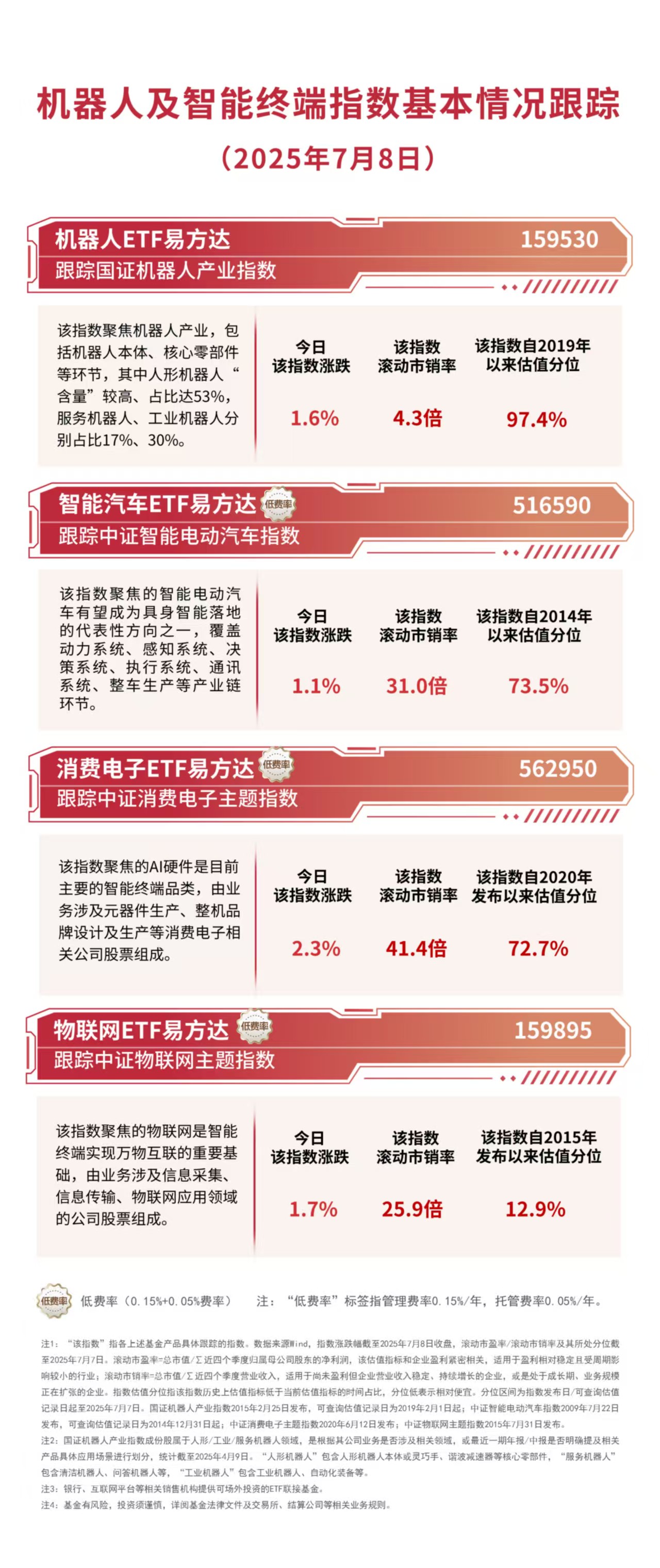 截至收盘,国证机器人产业指数上涨1.6%,中证智能电动汽车指数上涨1.1%,中证消费电子主题指数上涨2.3%,中证物联网主题指数上涨1.7%。