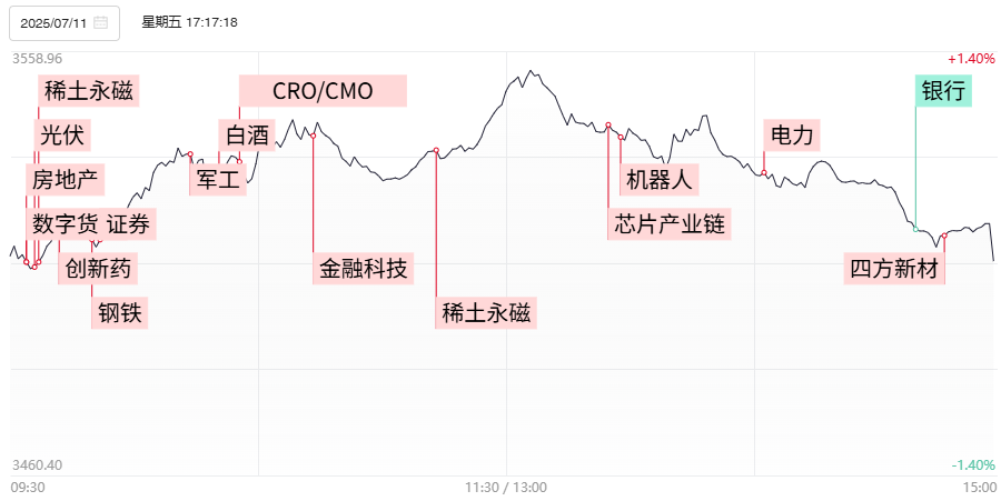 财联社7月14日电,市场全天冲高回落,三大指数小幅上涨。个股涨多跌少,全市场超2900只个股上涨。沪深两市全天成交额1.71万亿,放量2180亿,成交额创3月15日以来新高。1)上海市国资委党委7月10日召开中心组学习会,围绕加密货币与稳定币的发展趋势及应对策略开展学习。该消息再度对稳定币概念形成提振,并向RWA、互联金融等方向展开扩散,在古鳌科技、市北高新、绿地控股等多股早早封死涨停带动下,人气中军恒宝股份尾盘封涨停并续创阶段新高。2)包钢股份和北方稀土公告称,拟上调2025年第三季度稀土精矿关联交易价格,叠加此前预告中报净利润大幅预增利好,稀土永磁板块持续站上风口,北方稀土实现连板晋级外,北交所奔朗新材在内的十余股涨停。3)7月10日,国家医保局明确2025年基本医保药品目录调整和商业健康保险创新药品目录制定将同步进行。CXO概念近期持续展开大幅补涨,药明康德涨停创出2023年12月以来新高,博腾股份、奥浦迈双双涨超10%。而益方生物、前沿生物、诺诚健华、首药控股等多只科创板个股悉数大涨。4)据SMM,多晶硅料、N型硅片、TOPCon电池组件在内的多个光伏产业链环节悉数迎来涨价,光伏概念人气居高不下,国晟科技、京运通实现连板晋级,高位人气股亚玛顿午后反包涨停。