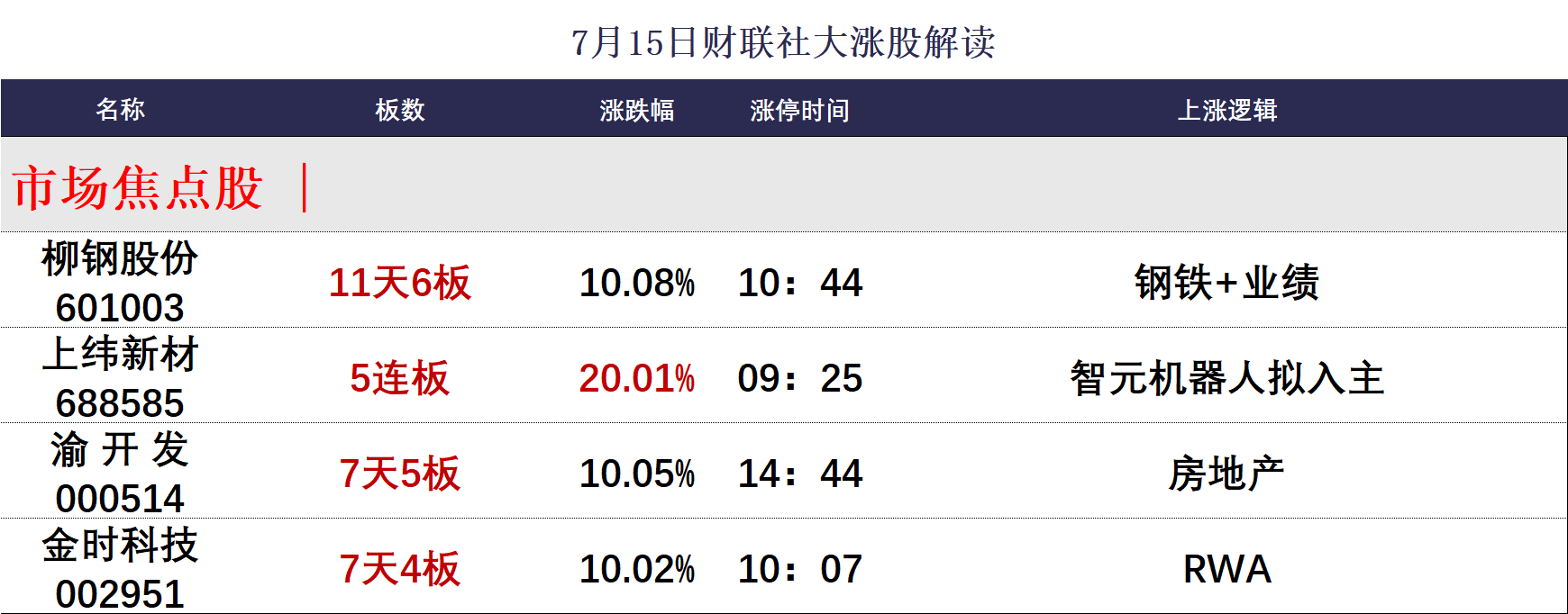今日共42股涨停,连板股总数11只,22股封板未遂,封板率为66%(不含ST股、退市股)。焦点股方面,智元机器人拟入主的上纬新材20CM5连板,业绩预增的钢铁股柳钢股份11天6板,房地产板块渝开发7天5板。