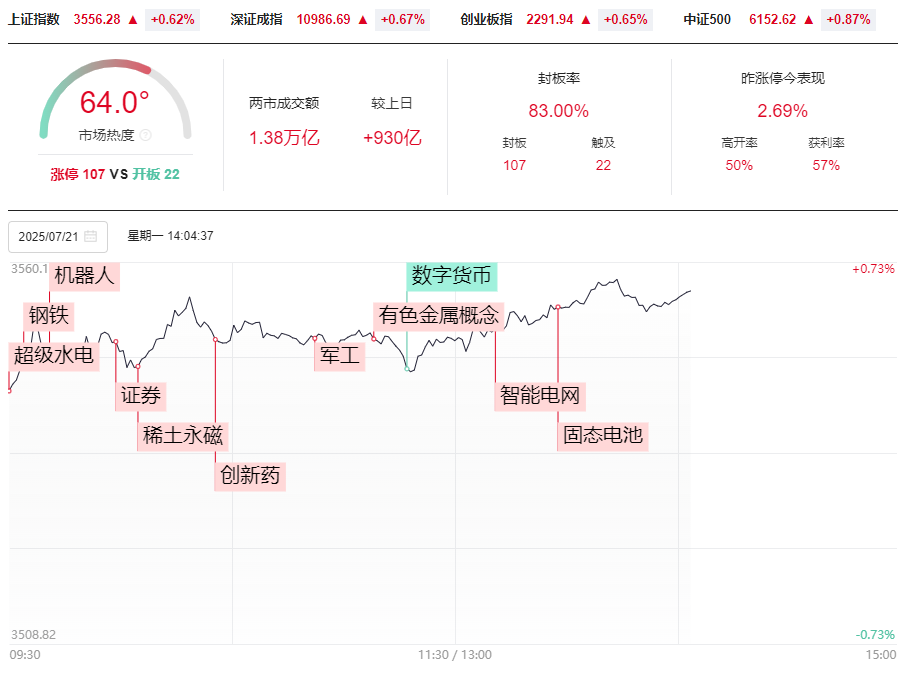 市场午后强势震荡,三大指数仍小幅上涨。成交量方面,午后第一个小时两市放量240亿。板块方面,午后市场热点较为杂乱。短线方面,情绪重回活跃,昨日连板股多数上涨,涨停晋级率接近50%。此外今日市场涨停个股以及上涨个股数量均创近期新高。
