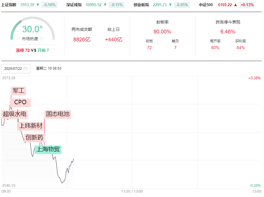 市场早盘震荡调整,三大指数小幅下跌。成交量方面,第一个小时两市放量468亿元。板块方面,早盘市场热点较为杂乱,CPO、军工、创新药、固态电池等多个方向均有所活跃,但大部分热点呈现冲高回落走势。超级水电概念股维持强势,前排个股多数涨停晋级,后排个股则以回落为主。