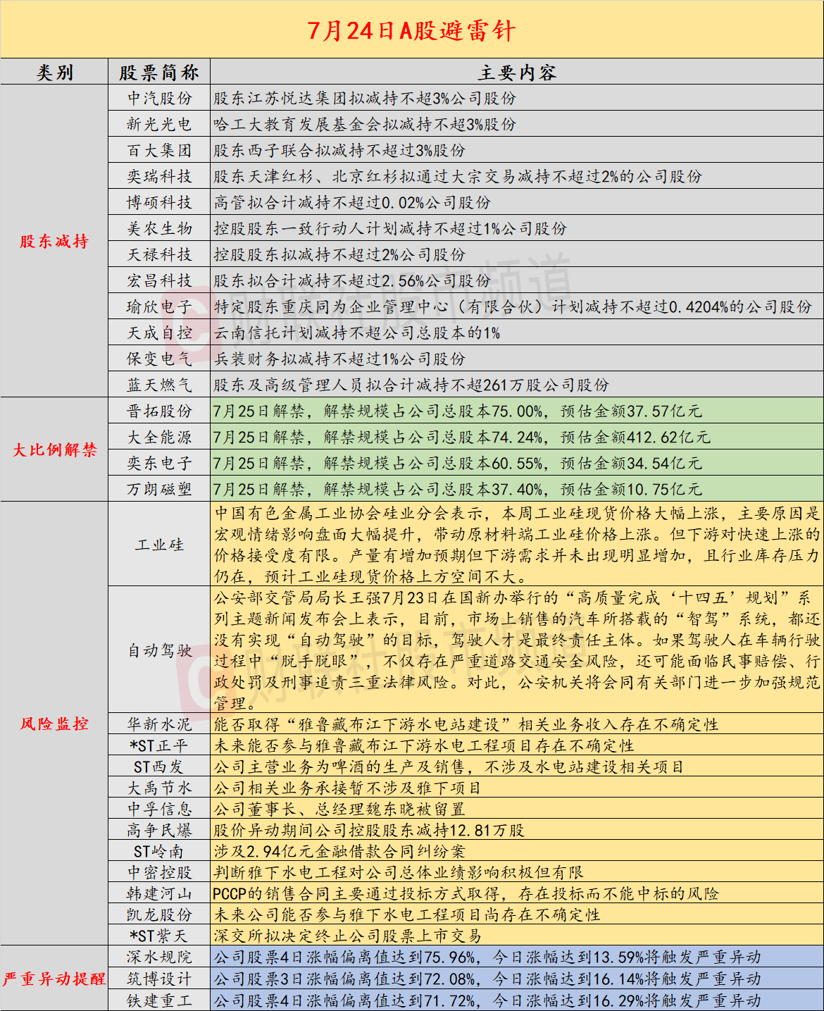 昨日公告的A股拟减持的公司数量较之前有所减少,中汽股份股东江苏悦达集团拟减持不超3%公司股份,新光光电股东哈工大教育发展基金会拟减持不超3%股份;大全能源、晋拓股份将迎来超七成以上解禁;工业硅现货价格大幅上涨,但下游对上涨的价格接受度有限;三连板华新水泥公告,能否取得“雅鲁藏布江下游水电站建设”相关业务收入存在不确定性;公安机关将会同有关部门进一步加强“智能驾驶”规范管理;大禹节水表示,公司相关业务承接暂不涉及雅下项目;特朗普将对大部分国家征收15%至50%的简单关税。