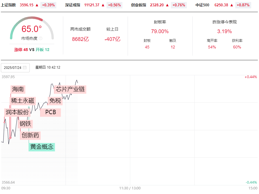 市场早盘震荡反弹,三大指数小幅上涨。成交量方面,第一个小时两市缩量498亿元。板块方面,早盘市场热点较为杂乱,海南、超级水电、稀土等方向表现活跃,其中海南和超级水电都走出强势反包走势,此外昨日冲高回落的券商股今日也再度走强。下跌方面,银行股再度展开调整。