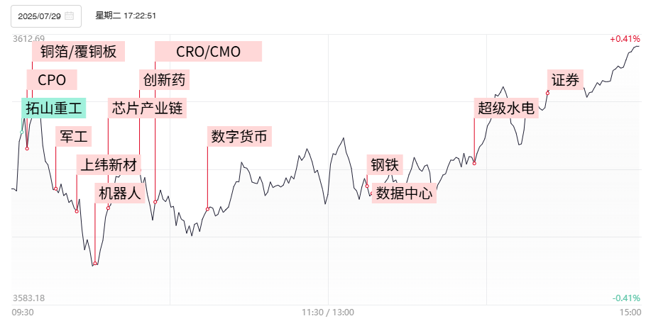 财联社7月30日电,上个交易日市场全天震荡走高,创业板指领涨。个股跌多涨少,全市场超3000只个股下跌。沪深两市全天成交额1.8万亿,较前日放量609亿。1)多家机构研报指出,英伟达考虑将在Rubin Ultra架构上考虑新方案,使用CoWop工艺,将芯片直接封装在PCB上, 该技术将载板和PCB进一步融合,将显著提升PCB价值量。PCB以及HVLP铜箔产业链持续站上风口,20cm人气股方邦股份强势晋级2连板,胜宏科技、景旺电子等趋势核心继续创出历史新高。2)国内CRO巨头药明康德上半年业绩超预期,药明康德AH股受提振双双大涨超7%,进而带动睿智医药、药石科技、九洲药业等低位CXO品种展开大面积补涨。而创新药方面,辰欣药业、亚太药业双双实现连板晋级,广生堂等趋势人气核心继续刷新阶段新高。3)香港稳定币条例落地在即,稳定币概念股仍反复活跃,恒生电子、国投智能触及涨停,此外具备香港券商业务的中银证券午后一度触及涨停。不过东信和平、金时科技等稳定币概念前期人气股整体表现则相对沉寂。4)近期多家上市公司通过互动平台等途径发布公司参与超级水电项目业务最新进展,午后超级水电展开一波像样回流,西藏天路、西宁特钢等多只板块内人气股展开反核涨停,不过板块内部分前排核心的回流仍难阻止后排品种遭遇淘汰的过程,包括盾构机等具备高辨识度的细分的修复力度同样有限。