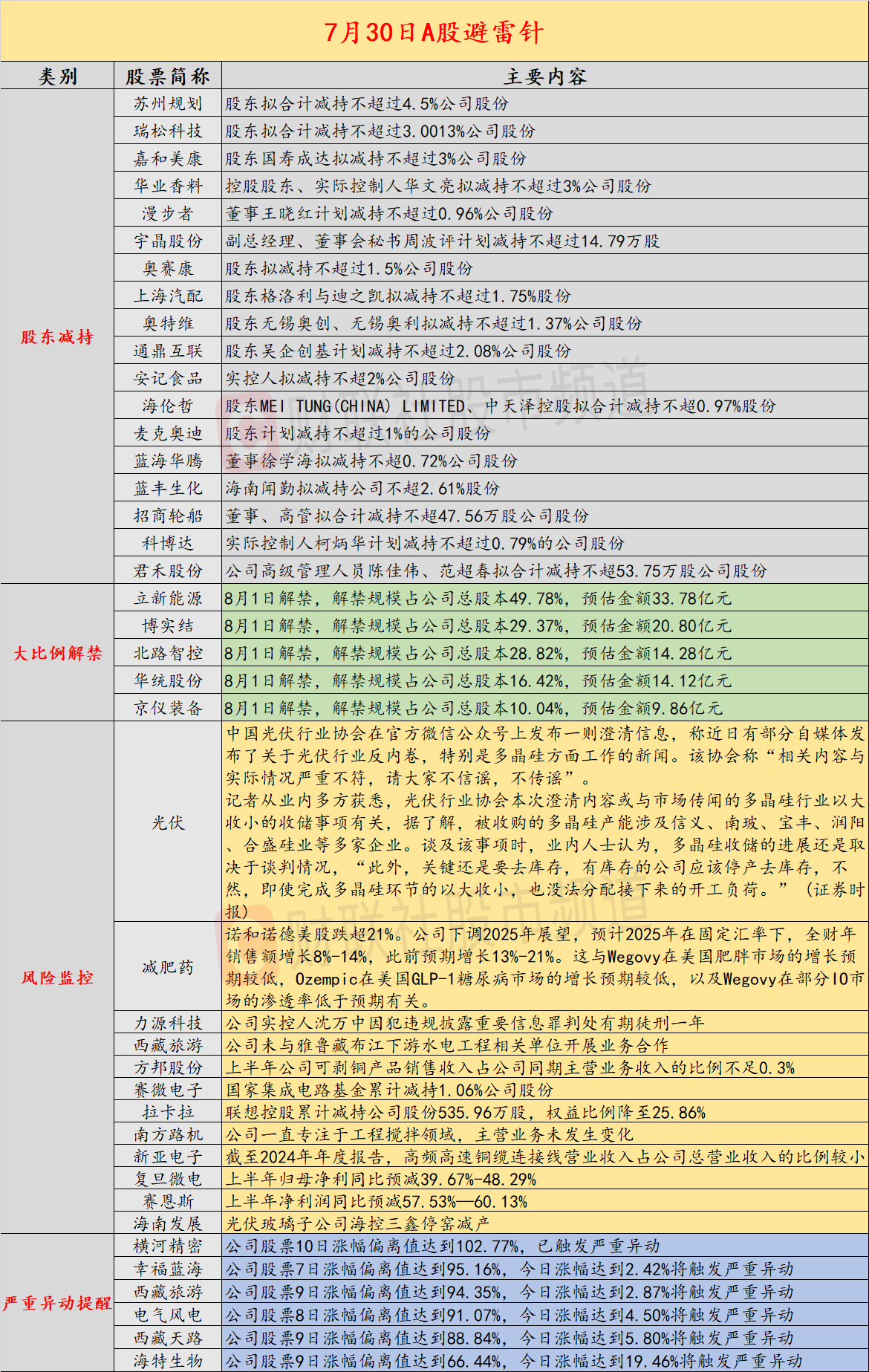 昨日公告的A股拟减持的公司数量较之前有所增多,苏州规划股东拟合计减持不超过4.5%公司股份,瑞松科技股东拟合计减持不超过3.0013%公司股份;立新能源、博实结将迎来超二成以上解禁;1-6月国有企业营业总收入40.75万亿元,同比下降0.2%;力源科技公司实控人沈万中因犯违规披露重要信息罪判处有期徒刑一年;光伏行业协会澄清涉多晶硅传闻,“以大收小”收储进展仍有不确定性;7连板西藏旅游提示,公司未与雅鲁藏布江下游水电工程相关单位开展业务合作;美股三大指数集体收跌,热门科技股多数下跌。