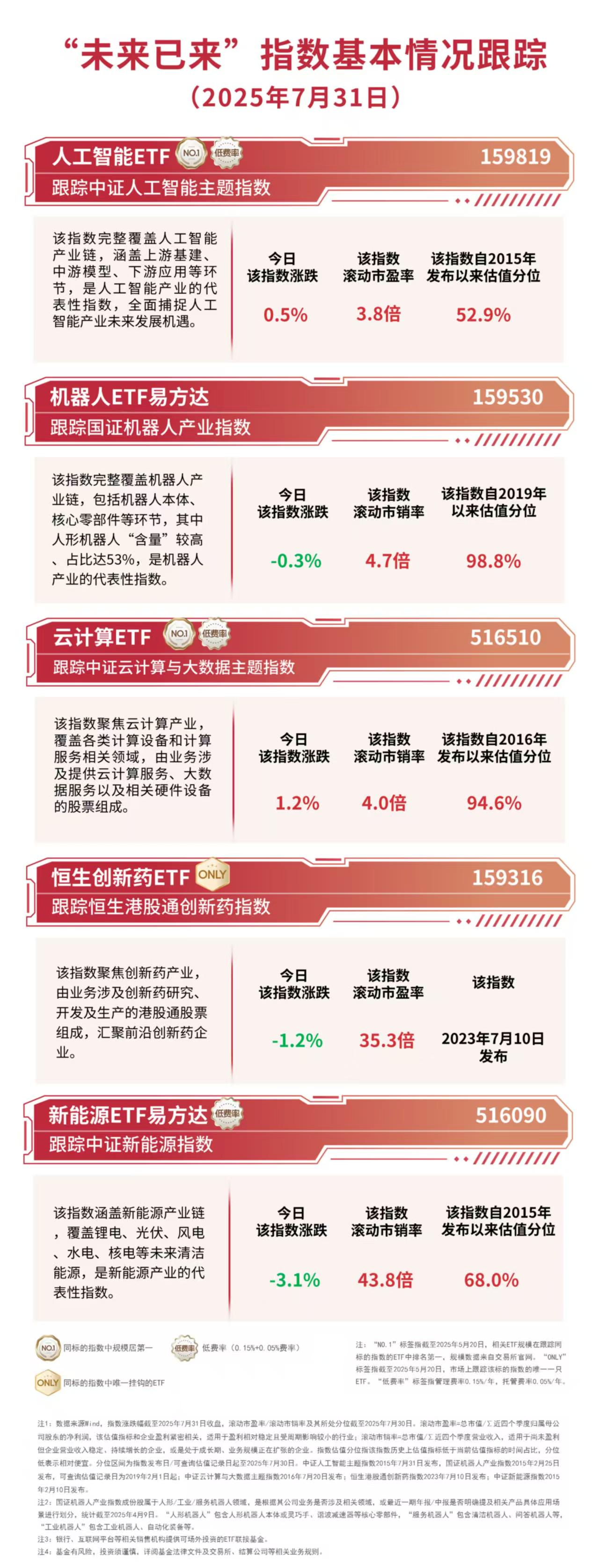 截至收盘,中证云计算与大数据主题指数上涨1.2%,中证人工智能主题指数上涨0.5%,国证机器人产业指数下跌0.3%,恒生港股通创新药指数下跌1.2%,中证新能源指数下跌3.1%。