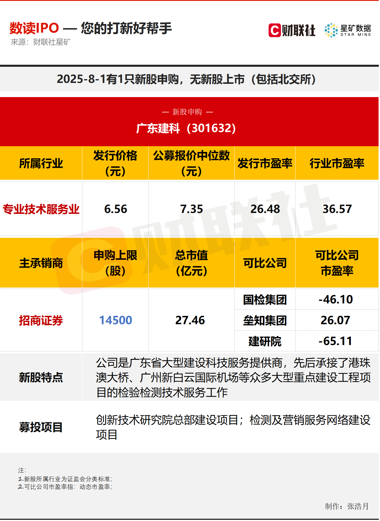 财联社8月1日电,今日有1只新股申购,为创业板的广东建科;无新股上市。广东建科是广东省大型建设科技服务提供商。