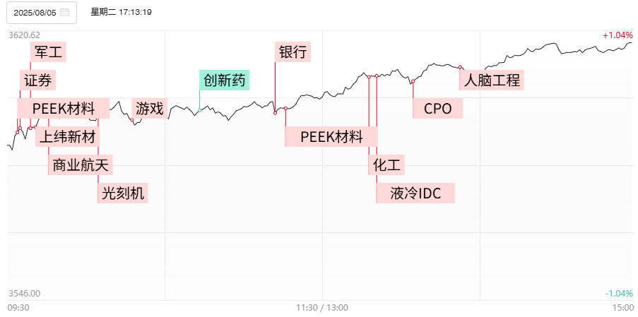 财联社8月6日电,上个交易日市场全天震荡走高,沪指重回3600点上方,再创年内收盘新高。个股涨多跌少,全市场超3900只个股上涨。沪深两市全天成交额1.6万亿,较前日放量975亿。1)多重利好叠加持续催热机器人产业链,上纬新材复牌涨停走出17天12板,自7月以来累计涨超13倍,带动板块内20厘米的东杰智能晋级3连板。随着特斯拉为代表的海外大厂抑或是宇树、智元等国内企业均深度向轻量化发展,PEEK材料概念再度大放异彩,新瀚新材、中欣氟材等涨停,金属注射成型技术(MIM)也再度获得资金青睐,悦安新材日内一度涨超10%。2)军工股持续站上风口,核心品种长城军工、国机精工、北方长龙续创历史新高。不过板块内前排股强势的同时,恒宇信通、科思科技、爱乐达等20厘米弹性品种日内悉数走出冲高回落留下长上影线。3)全球铜连接巨头安费诺拟斥资105亿美元收购康普控股的连接与电缆解决方案业务,早盘一度承压的算力硬件股午后再度爆发,长芯博创午后一度逼近20cm涨停并续创历史新高,太辰光、仕佳光子等日内悉数冲高。4)创新药概念此前连续加速后,走出冲高回落行情,10厘米人气股昂利康一度触及跌停,南新制药、舒泰神等纷纷位居跌幅前列。但随着午后港股通创新药指数重拾升势,君实生物、华东医药、博瑞医药等大市值品种再度转强,20厘米人气股广生堂也再创阶段新高。