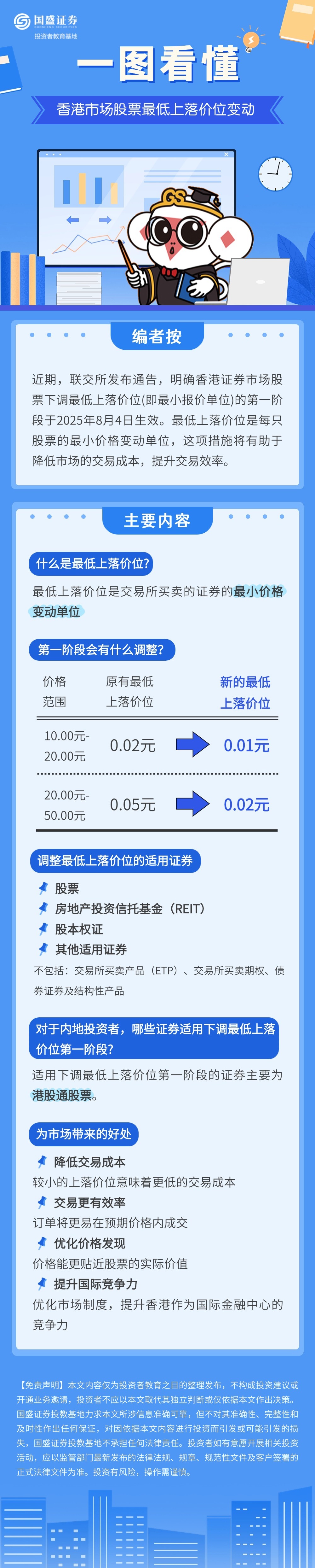 近期,联交所发布通告,明确香港证券市场股票下调最低上落价位(即最小报价单位)的第一阶段于2025年8月4日生效。最低上落价位是每只股票的最小价格变动单位,这项措施将有助于降低市场的交易成本,提升交易效率。下面,一起来看看吧!