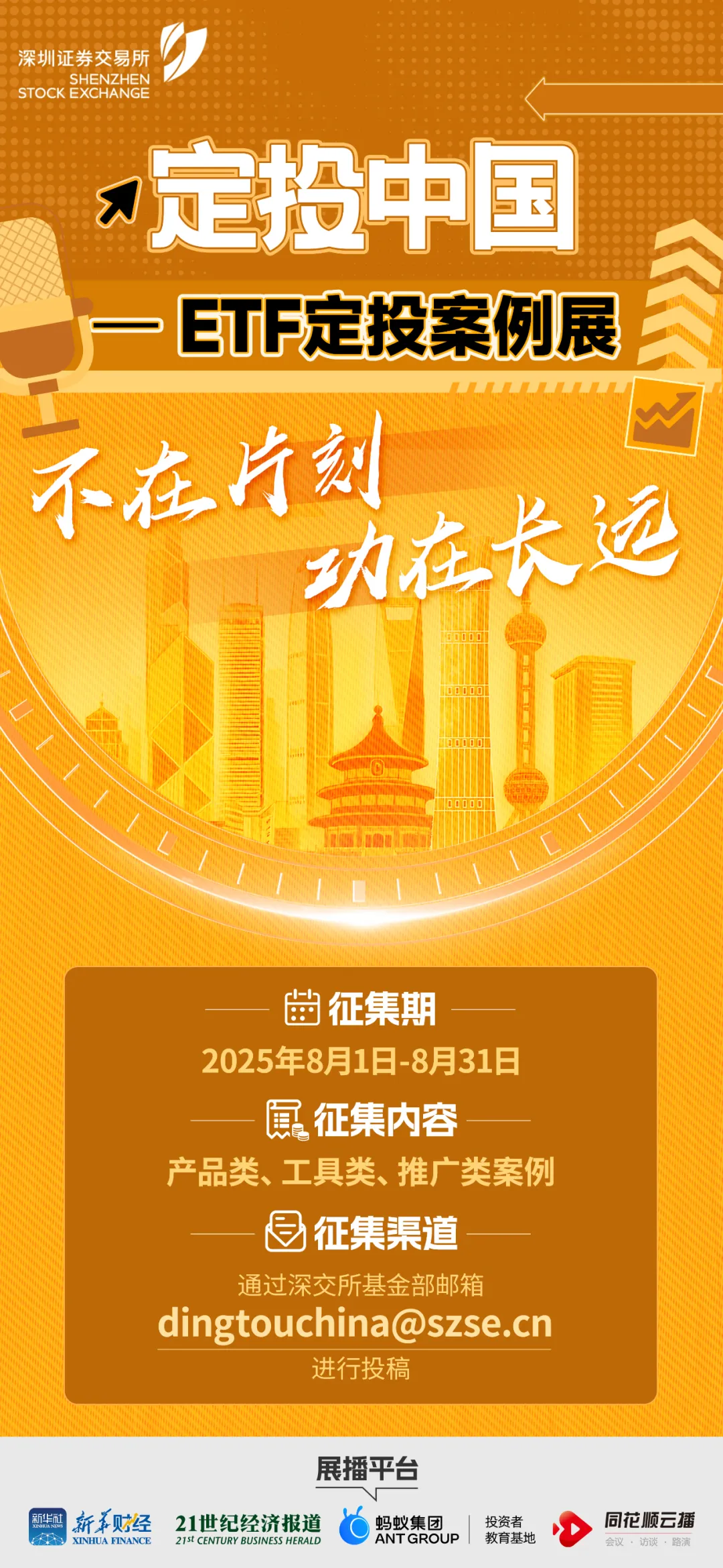 “定投中国——ETF定投案例展”活动由深交所组织基金管理人、券商、基金代销机构、媒体等主体共同参与,通过图文、视频、HTML5页面等创作方式,围绕产品、工具、市场等维度进行案例展示,并重点突出定投策略的长期性、稳定性、便捷性等特点,向投资者生动展示ETF定投的优势特点和应用环境,引导树立理性投资、价值投资、长期投资理念。