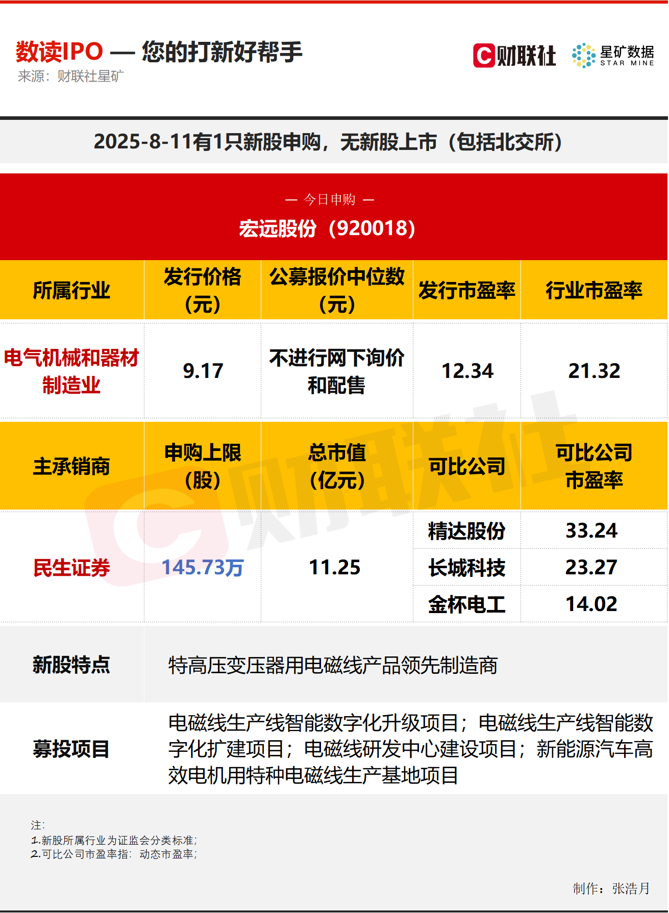 财联社8月11日电,今日有1只新股申购,为北交所的宏远股份;无新股上市。宏远股份主要从事电磁线的研发、生产和销售。