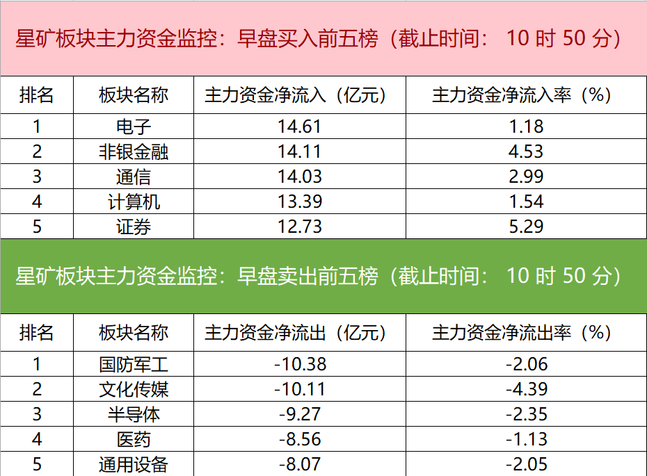财联社8月11日电,财联社星矿数据显示,今日早盘主力资金净流入电子、非银金融、通信等板块,净流出国防军工、文化传媒、半导体等板块,其中电子板块净流入超14亿元。个股方面,同花顺大涨,主力资金净买入7.01亿元位居首位,新易盛、东方财富、贵州茅台获主力资金净流入居前;中国船舶遭净卖出超6亿元,宁波韵升、华银电力、北方稀土主力资金净流出额居前。