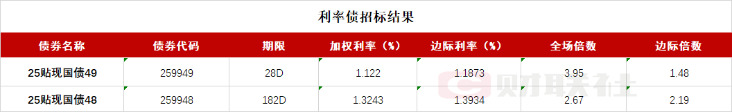 新债招标|财政部两期国债已招标结束 28D期品种加权中标利率1.122%