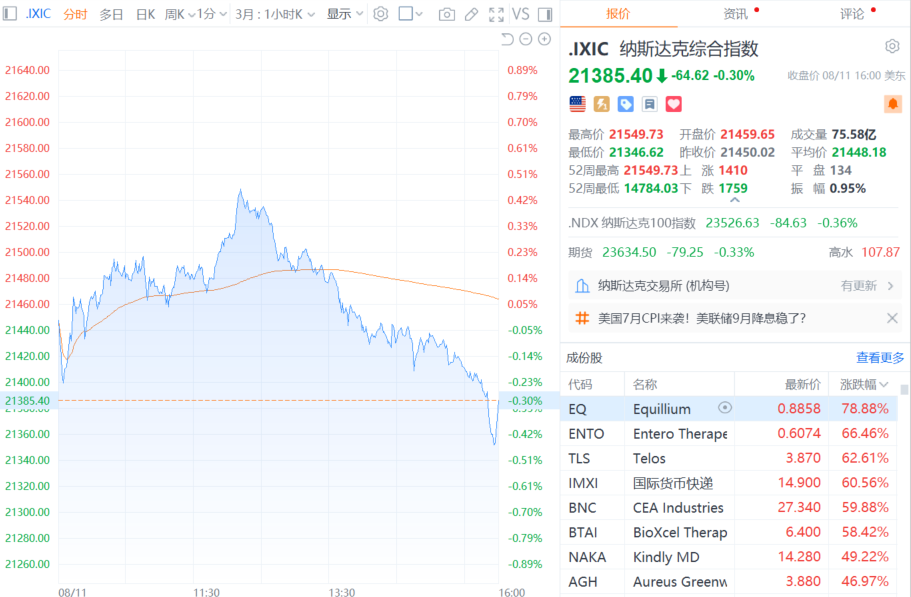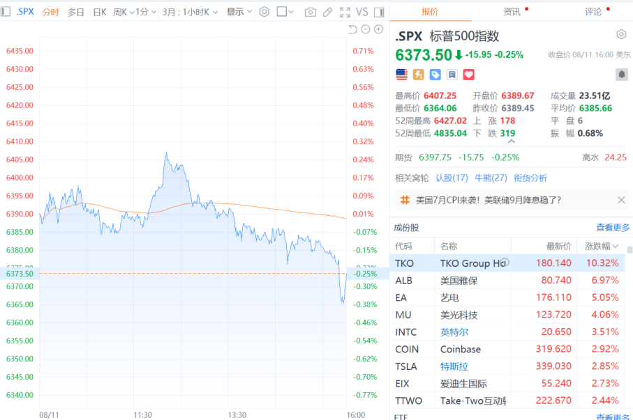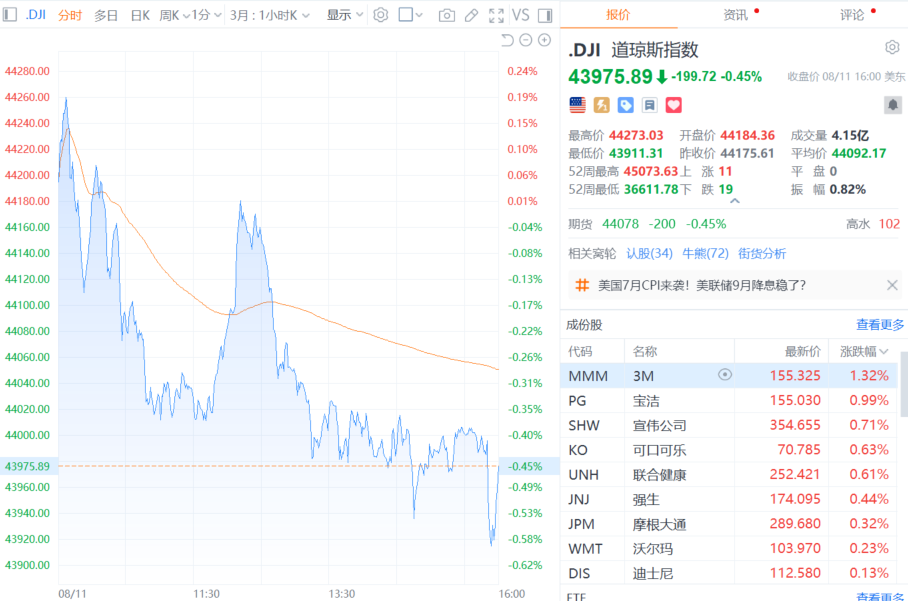 财联社8月12日电,美股三大指数小幅收跌,道指跌0.45%,纳指跌0.3%,标普500指数跌0.25%。大型科技股多数下跌,苹果、微软、英伟达、谷歌、亚马逊、Meta、AMD小幅下跌;英特尔涨超3%,特斯拉涨超2%,日线录得四连涨。房利美涨超15%,房地美涨逾13%,均创2008年以来收盘新高。