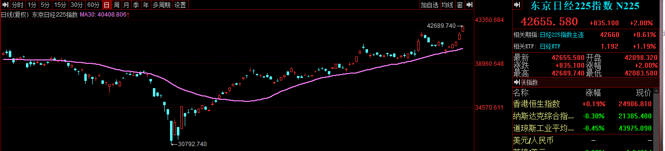 财联社8月12日电,日经225指数涨幅扩大至2%,报42657.97点,刷新历史新高。
