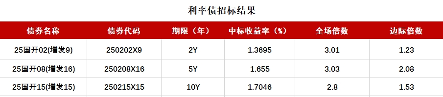 财联社8月12日电,国家开发银行三期金融债已结束招标,其中,10年期固息债“25国开15(增15)”中标利率为1.7942%,全场倍数2.8,边际倍数1.53;5年期固息债“25国开08(增16)”中标利率为1.6562%,全场倍数3.03,边际倍数2.08;2年期固息债“25国开02(增9)”中标利率为1.5193%,全场倍数3.01,边际倍数1.23。