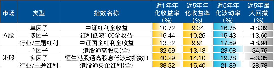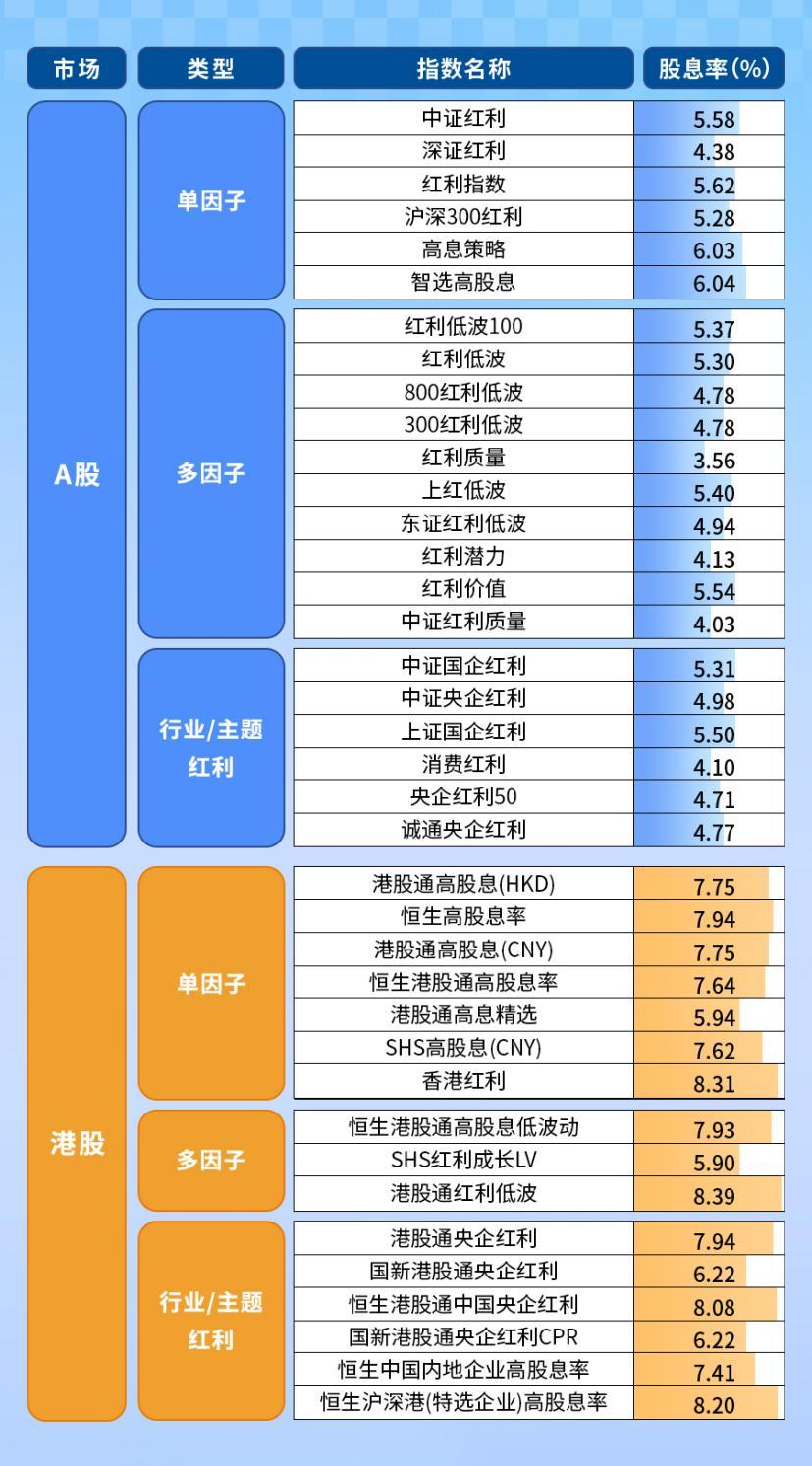首先,可按成份股的选样范围分为A股红利指数和港股红利指数。从近些年的情况来看,港股红利指数的波动率和股息率通常都高于A股红利指数;