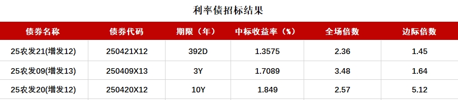 财联社8月13日电,中国农业发展银行三期金融债已结束招标,其中,10年期固息债“25农发20(增12)”中标利率为1.849%,全场倍数2.57,边际倍数5.12;3年期浮息债“25农发09(增13)”中标利率为1.7089%,全场倍数3.48,边际倍数1.64;1.074年期固息债“25农发21(增12)”中标利率为1.3575%,全场倍数2.36,边际倍数1.45。