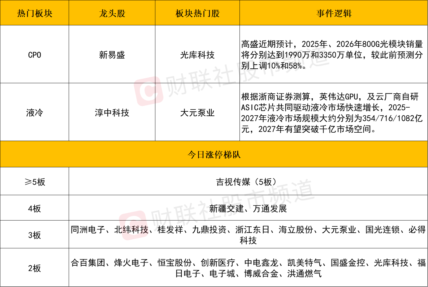 算力硬件股依旧是今日盘面的领涨核心。工业富联、沪电股份、深南电路等涨停,新易盛、中际旭创、胜宏科技均涨超9%续创历史新高。并且也开始向后排扩散,如光库科技、罗博特科、剑桥科技等个股同样获得资金补涨拉升。随着前排核心标的整体来至相对高位,对于此前没有先手筹码的增量资金而言,或更偏好于进行低位挖潜。后续仍可留意热门板块中一些在低位异动放量的个股,另一方面,也可以跟随相关产业链寻找一些仍具有预期差的细分。