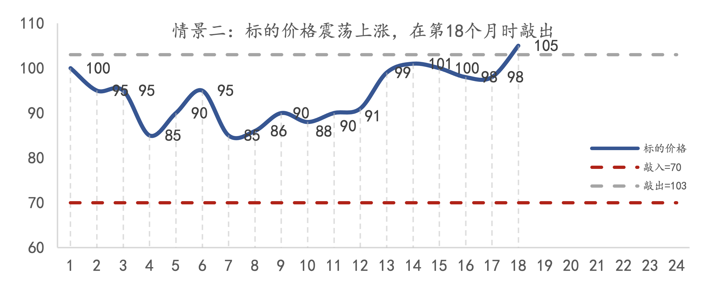 2)标的震荡调整后上行,于第18个月敲出(降敲雪球第13个月敲出):