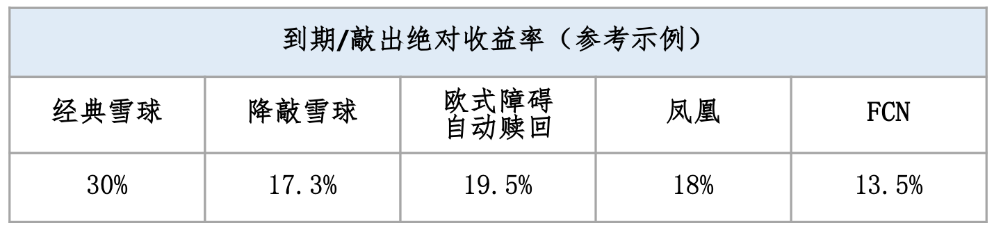 降敲雪球第13个月敲出,敲出观察日获得持有期(13个月)的票息,其余结构第18个月敲出,敲出观察日获得持有期(18个月)的票息,票息最高的经典雪球收益最高,票息最低的FCN则收益最低。