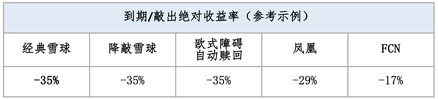 所有结构均需承担标的较大的下跌亏损,最终收益均为负,但此时凤凰和FCN因票息收益的补偿,亏损较小。