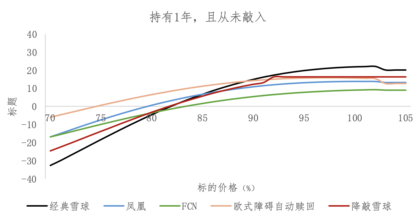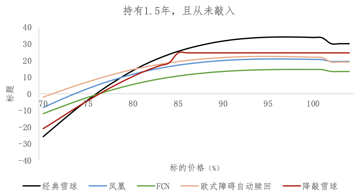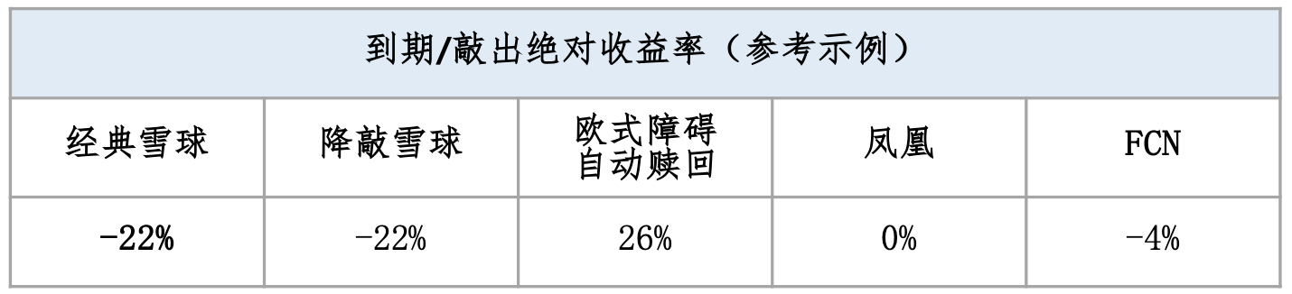所有结构到期日获得持有期(24个月)的票息。此时票息最高的经典雪球收益最高,票息最低的FCN则收益最低。