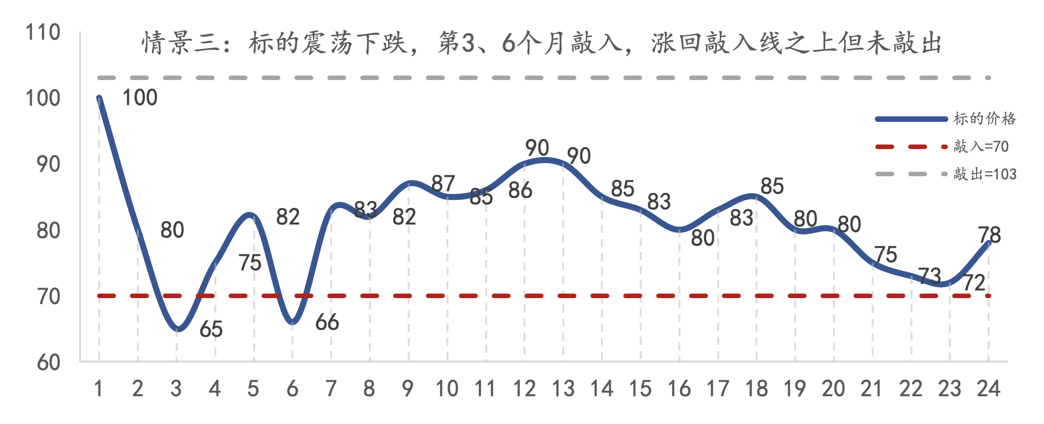 3)标的于第3个月跌破过敲入价格,后回升但未敲出至到期终止: