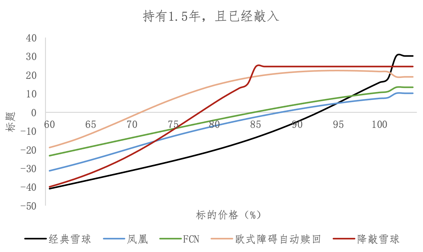 假设持有一个两年期结构,敲入价格系数为70%,敲出价格系数为103%,预付金比例100%,其中,降敲雪球每个月敲出价格下降1%,观测在合约未到期时,以下2种未触发或已触发敲入事件的情形下,分析在分别持有时点1年和持有时点1.5年时,不同结构的时点估值变化,