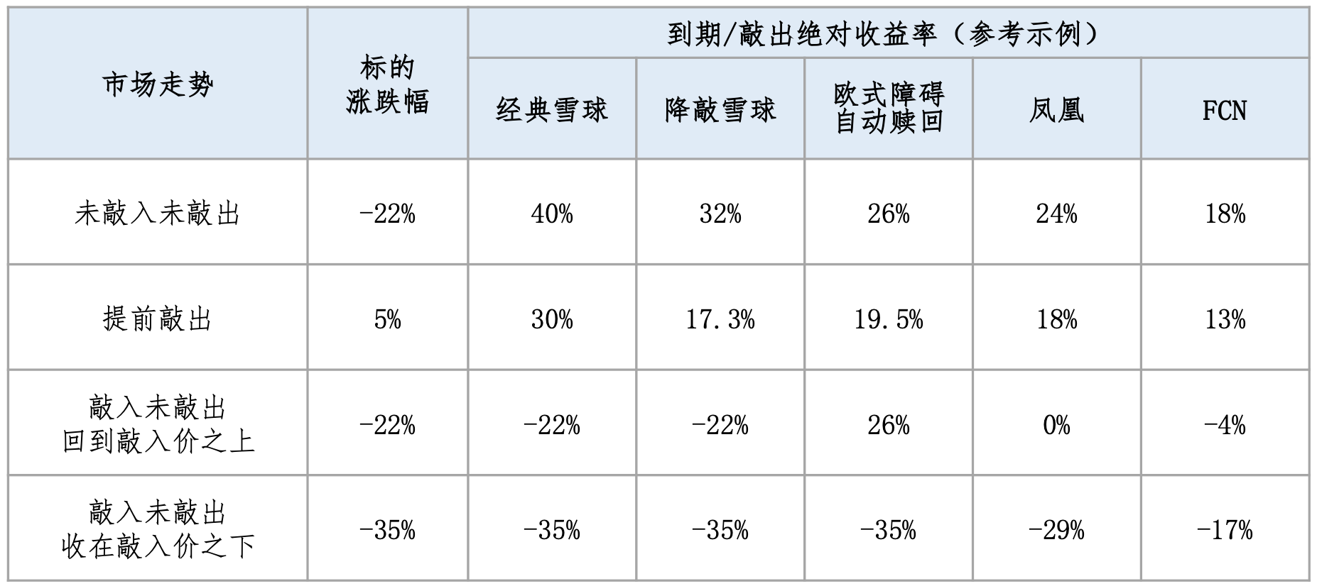 我们汇总各种市场走势下5种自动赎回结构的期末收益率: