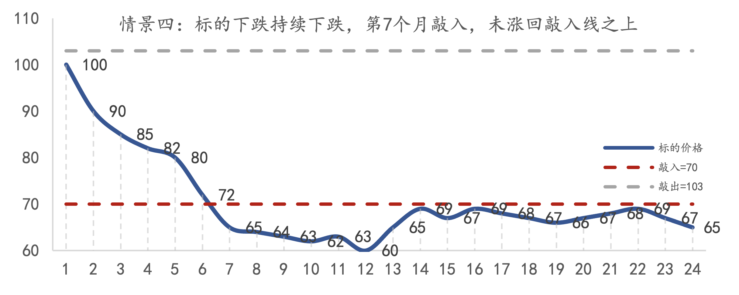 4)标的于第7个月跌破敲入价格,后持续在敲入价格以下至到期终止: