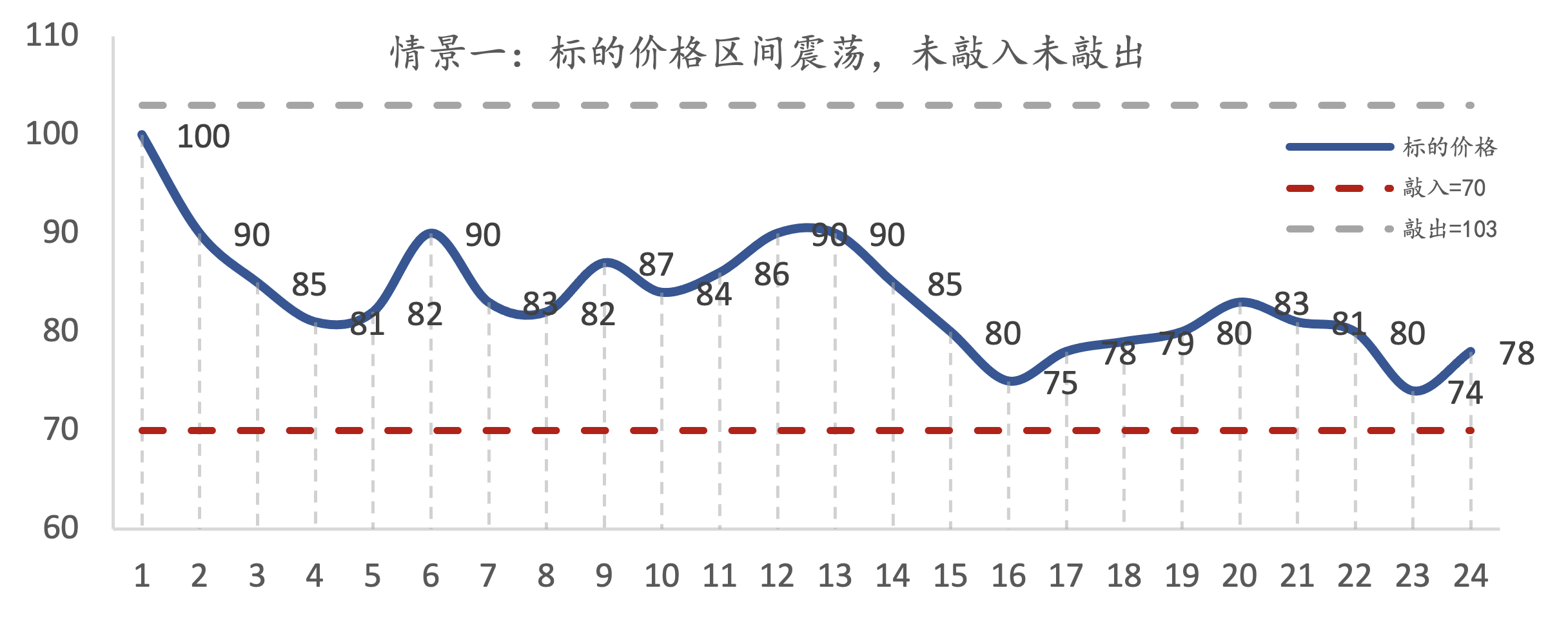 1)标的价格在敲入价格、敲出价格内震荡,到期终止:
