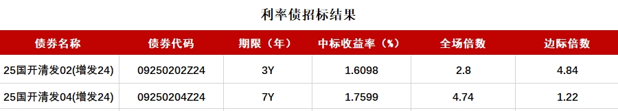 财联社8月14日电,国家开发银行在上清所招标的两期金融债已结束发行,其中,7年期固息债“25国开清发04(增发24)”中标利率为1.7599%,全场倍数4.74,边际倍数1.22;3年期固息债“25国开清发02(增发24)”中标利率为1.6098%,全场倍数2.8,边际倍数4.84。
