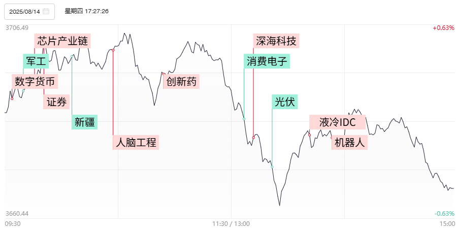 财联社8月15日电,上个交易日市场全天震荡调整,创业板指领跌,沪指3700点得而复失,终结8连阳。个股跌多涨少,全市场超4600只个股下跌。沪深两市全天成交额2.28万亿,较前日放量1283亿。1)昨日腾讯控股发布的二季度财报显示,其营收、净利润等指标均实现超预期增长,GPU租赁和API token使用率的超预期提升反映出AI需求的高景气。国产算力概念延续近期强势,算力芯片龙头寒武纪涨逾10%再创历史新高,海光信息也日内一度涨逾10%。算力租赁方向也展开积极补涨,华为算力概念人气股华胜天成反包涨停,有方科技、汇纳科技等低位股纷纷得到资金挖掘展开补涨。2)全球首届世界人形机器人运动会开幕,其中宇树科技等国内领军企业悉数参与。机器人概念股日内呈现探底回升行情,宣布递交港股上市申请的卧龙电驱午后涨停创出历史新高,20厘米人气股上纬新材也企稳反弹一度涨逾10%。3)香港联交所最新股权披露信息显示,中国平安和旗下资产管理公司平安资管分别增持了中国太保H股股份,触发举牌线,也是时隔6年后中国太保H股再度获得同业巨头举牌。保险板块全天强势,中国太保A、H股双双涨近5%,后者创出历史新高。4)OpenAI及其首席执行官山姆·奥特曼将支持新脑机接口公司MergeLabs,与马斯克的Neuralink展开竞争。脑机接口概念延续强势,盘中再度逆势拉升,10厘米人气股创新医疗缩量实现2进3,博拓生物、南京熊猫双双封板突破前高。