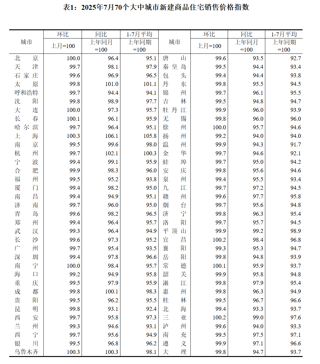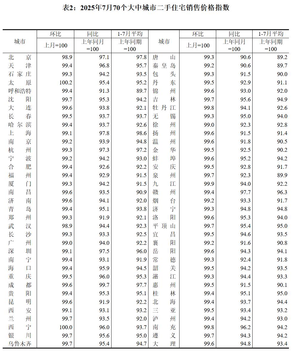 财联社8月15日电,国家统计局发布数据显示,2025年7月份,70个大中城市中,各线城市商品住宅销售价格环比下降,同比降幅整体有所收窄。7月份,一线城市新建商品住宅销售价格环比下降0.2%,降幅比上月收窄0.1个百分点。其中,北京持平,上海上涨0.3%,广州和深圳分别下降0.3%和0.6%。二线城市新建商品住宅销售价格环比下降0.4%,降幅扩大0.2个百分点。三线城市新建商品住宅销售价格环比下降0.3%,降幅与上月相同。7月份,一线城市二手住宅销售价格环比下降1.0%,降幅比上月扩大0.3个百分点。其中,北京、上海、广州和深圳分别下降1.1%、0.9%、1.0%和0.9%。二、三线城市二手住宅销售价格环比均下降0.5%,降幅均收窄0.1个百分点。