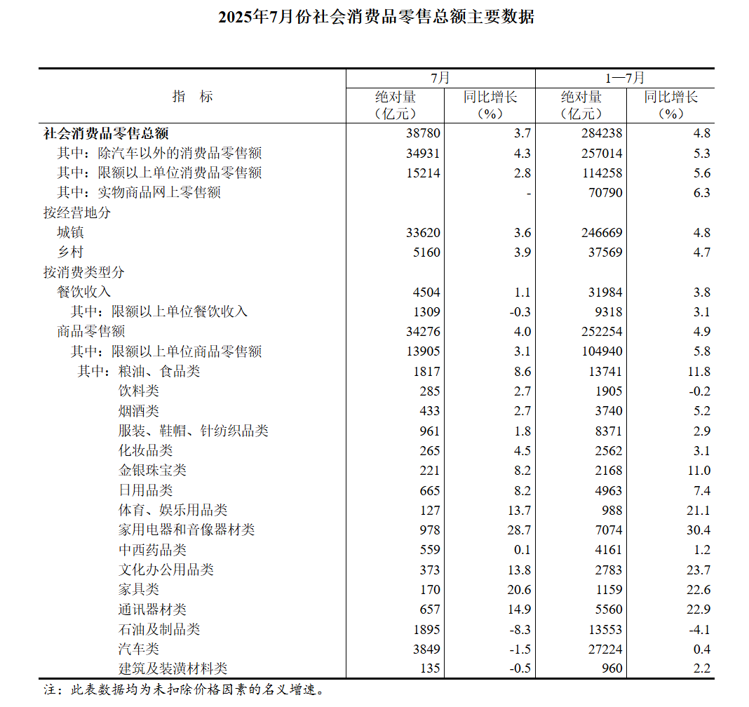 按经营单位所在地分,7月份,城镇消费品零售额33620亿元,同比增长3.6%;乡村消费品零售额5160亿元,增长3.9%。1—7月份,城镇消费品零售额246669亿元,增长4.8%;乡村消费品零售额37569亿元,增长4.7%。