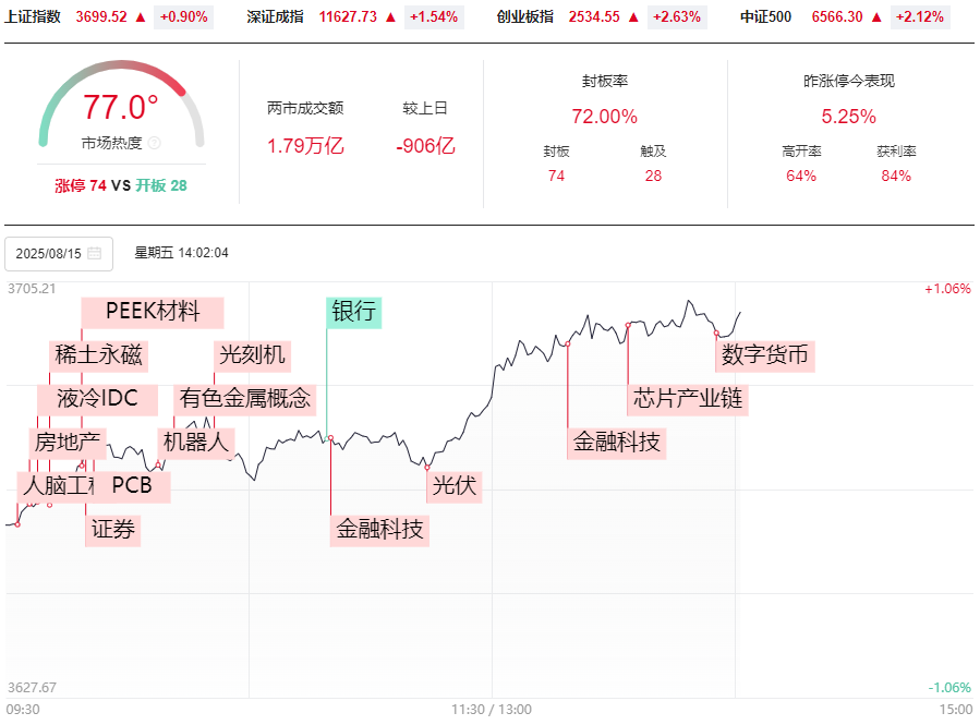 市场午后继续走高,沪指一度重回3700点。成交量方面,午后第一个小时两市放量126亿。板块方面,午后市场资金持续流入大金融方向,指南针、同花顺双双创历史新高。短线方面,情绪重回活跃,昨日连板股涨停晋级率超50%。此外,午后涨停及涨超10%的个股明显增多。