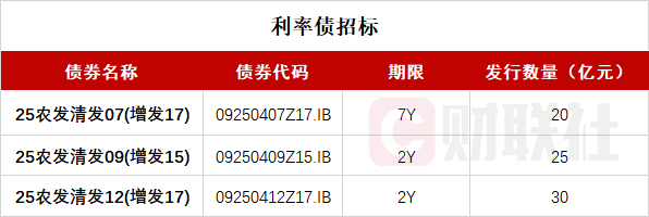 财联社8月19日电,按照此前公布的发行计划,中国农业发展银行将于下午14:00-15:00在上清所招标发行三期金融债,分别为:中国农业发展银行在上海清算所2025年第九期金融债券(第十五次增发),期限2Y,发行量不超过25亿元,票面利率1.45%;中国农业发展银行在上海清算所2025年第十二期金融债券(第十七次增发),期限2Y,发行量不超过30亿元,票面利率1.6%;中国农业发展银行在上海清算所2025年第七期金融债券(第十七次增发),期限7Y,发行量不超过20亿元,票面利率1.84%。