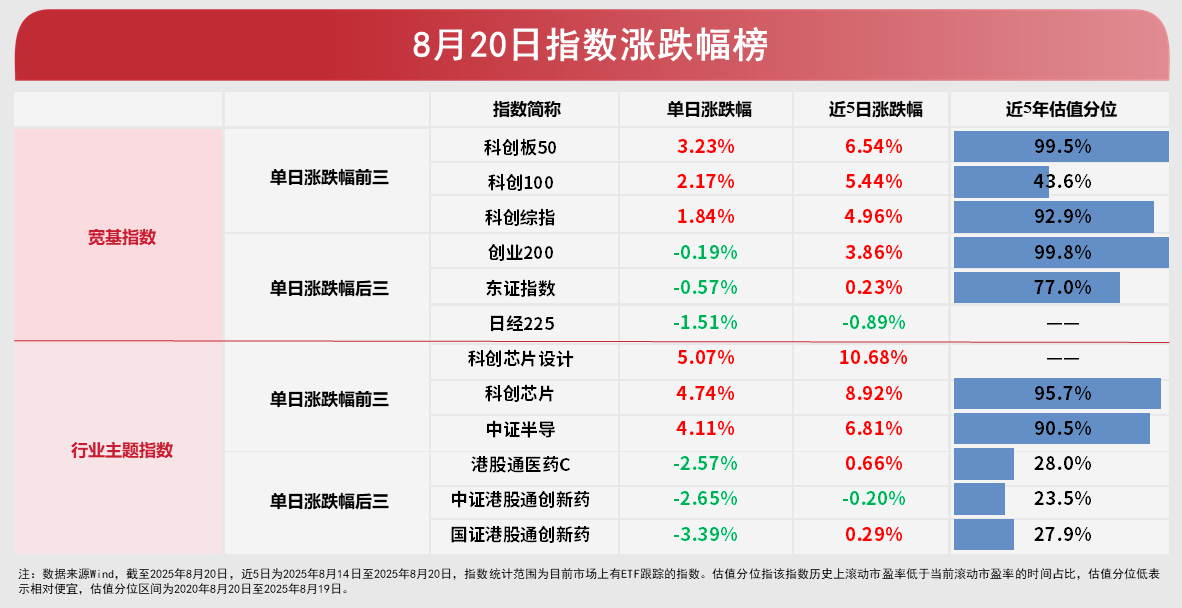 从指数角度看,受科技股爆发带动,科创板50指数大涨3.2%,领涨宽基,科创板50ETF(588080)等相关产品全天成交活跃,科创100指数、科创综指等科创板相关指数涨幅同样居前。