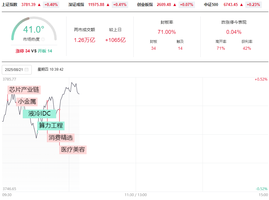 市场早盘探底回升,三大指数小幅上涨。成交量方面,第一个小时两市放量1099亿元。板块方面,早盘市场热点较为杂乱,金融科技、大消费、芯片等方向有所活跃,但强度有限。下跌方面,AI硬件股连板两日早盘出现跳水,但今日承接力度较弱。