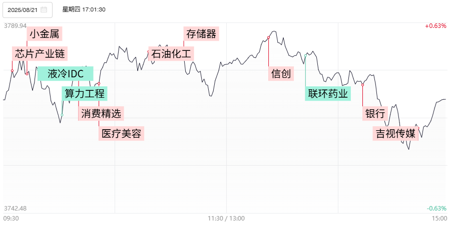 财联社8月22日电,上个交易日市场全天震荡调整,三大指数涨跌不一。个股跌多涨少,全市场超3000只个股下跌。沪深两市全天成交额2.42万亿,较前日放量158亿,成交额连续7个交易日超2万亿。1)随着我国多个国家级数字货币应用试点取得突破性进展,机构对人民币国际化进程预期颇为乐观。数字货币概念早盘大面积爆发并全天维持强势,10厘米低位连板股御银股份一字涨停晋级3连板,中油资本反包板再创阶段新高。2)8月18日,中国移动发布17亿元人工智能服务器集采中标公示,其中中兴通讯斩获整体中标份额的50%以上,金额约8.85亿元。受此消息刺激,国产算力概念再获提振,中兴通讯早盘一度触及涨停,浪潮信息早盘也一度冲高逾5%。受益于算力芯片国产化的翱捷科技、盛科通信也一度双双涨超10%。3)不少地方聚焦文旅、餐饮、赛事、演出等服务消费领域发布了消费券发放计划。大消费概念盘中再度异动,零售股汇嘉时代晋级2连板,此前2连板的白酒股酒鬼酒日内一度逼近涨停,而此前维持较好上升趋势的美容护理概念盘中迎来加速,拉芳家化触及涨停,洁雅股份、水羊股份也日内也冲高逾10%。4)近日,海南大学海洋清洁能源创新团队宣布,近日在“可燃冰”大规模利用领域实现重要突破。油气股盘中强势拉升,准油股份、神开股份双双涨停,新锦动力日内一度涨超10%。但有色和化工等顺周期方向表现不一,早盘一度冲高的钨、稀土永磁板块中除去完成重大资产置换的安源煤业封涨停外,中钨高新、北方稀土、盛和资源等基本呈现冲高回落行情。