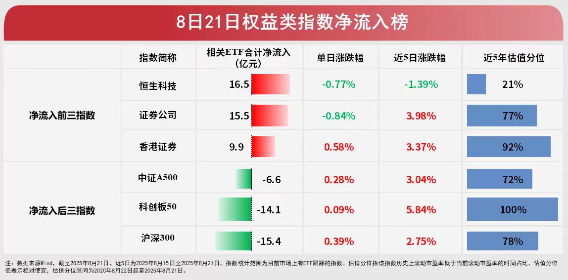 昨日市场震荡调整,沪指续创近10年新高,全市场ETF净流入近百亿元。从指数角度看,跟踪恒生科技指数的ETF合计“吸金”16.5亿元,位居第一,其中恒生科技ETF易方达(513010)净流入3.5亿元;中证全指证券公司指数紧随其后,相关产品合计“吸金”15.5亿元;仅有香港证券ETF(513090)一只产品跟踪的香港证券指数净流入也较多,约10亿元。