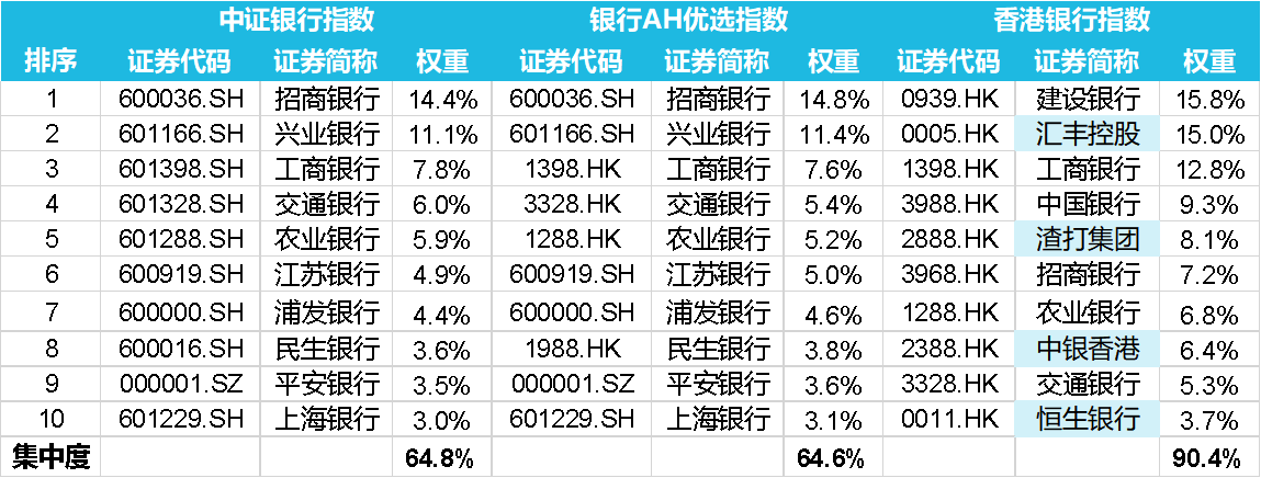 另外,从上面的表格我们可以看出,香港银行指数的前十大成份股集中度最高,为90.4%,而中证银行指数和银行AH优选指数的集中度都在65%左右。