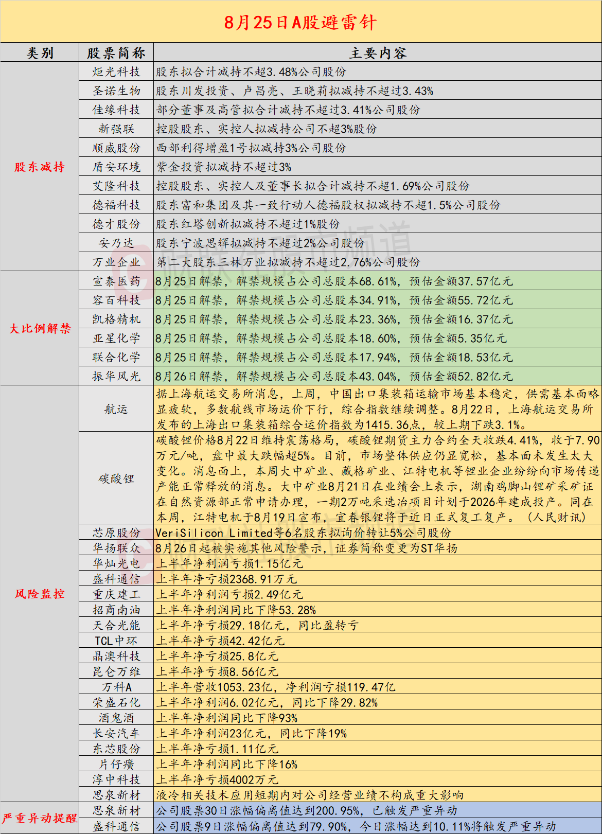 近日公告的A股拟减持的公司数量较之前有所增多,炬光科技股东拟合计减持不超3.48%公司股份,圣诺生物股东川发投资、卢昌亮、王晓莉拟减持不超过3.43%;宣泰医药、容百科技将迎来超三成以上解禁;上周运输市场继续调整,多数航线运价下跌;芯原股份VeriSilicon Limited等6名股东拟询价转让5%公司股份;碳酸锂期货回调,多家企业产能正常释放;华扬联众8月26日起被实施其他风险警示,证券简称变更为ST华扬;中信证券预计美国消费支出与私人投资增速或将继续面临下行压力。