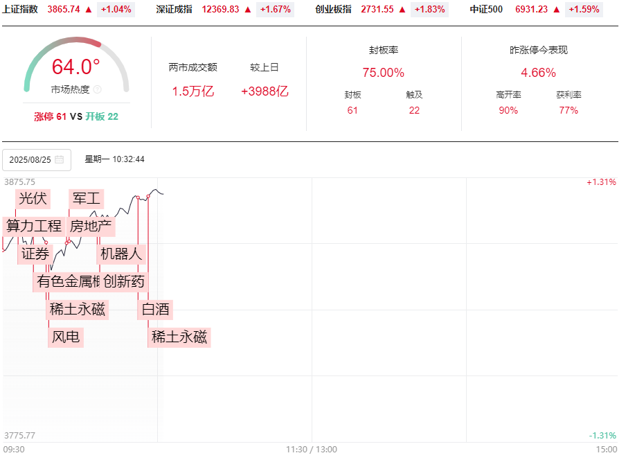 市场早盘延续升势,三大指数均涨超1%。成交量方面,第一个小时两市放量3999亿元。板块方面,早盘市场热点快速轮动,其中芯片、算力方向最为强势,稀土、有色、机器、地产等多股板块轮番活跃,市场或进入轮动补涨阶段。